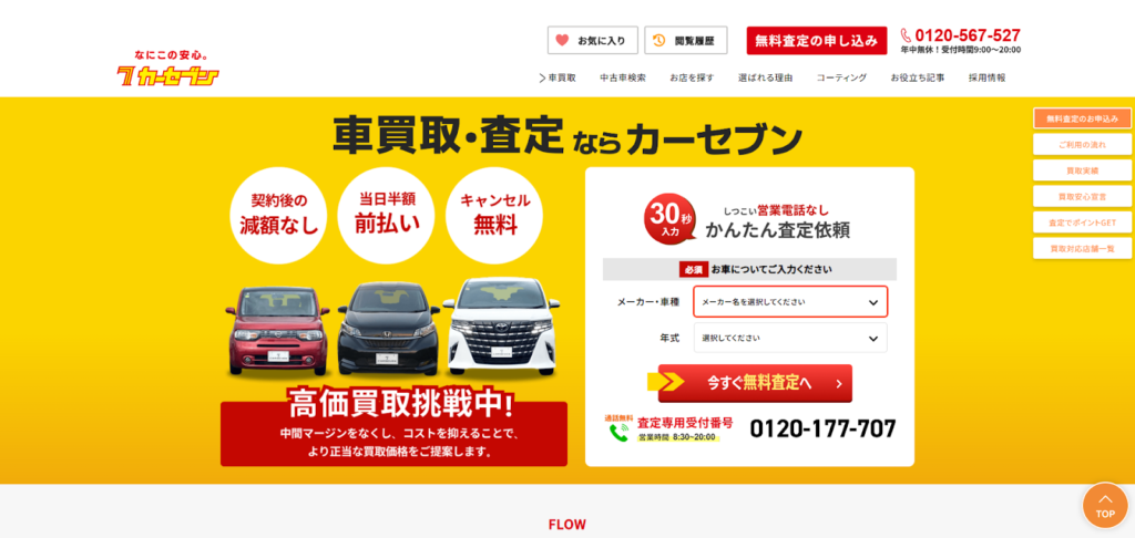 カーセブンは全国約160店舗を展開する車買取チェーンで、契約後の減額なしと7日間キャンセル無料を明示した安心宣言が大きな特徴です。売却後にトラブルが起きにくい仕組みが整っており、初めて車を売る方でも不安を感じにくい点が評価されています。
