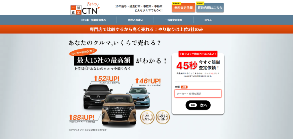 CTN一括査定は、車種や年式、走行距離や状態に応じて最適な買取業者を選定し、最大3社のみを紹介する仕組みが特徴です。一般的な一括査定のように多くの業者から連絡が来ることがなく、電話対応の負担を抑えながら比較できます。