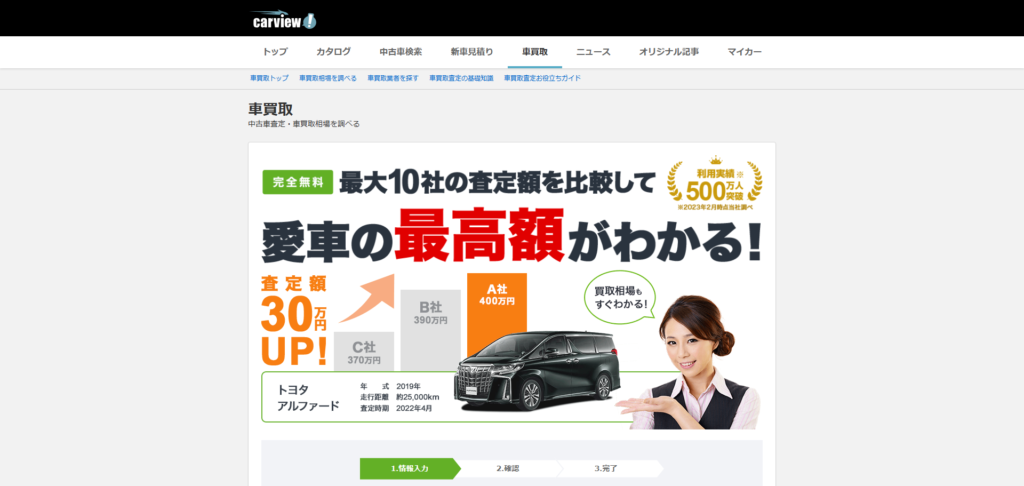 | カービュー | 一括査定サービス | 300社以上 | 無料 | あり | ・最大10社へ同時査定依頼可 ・LINEヤフー傘下で安心感 ・利用者500万人超の実績 |