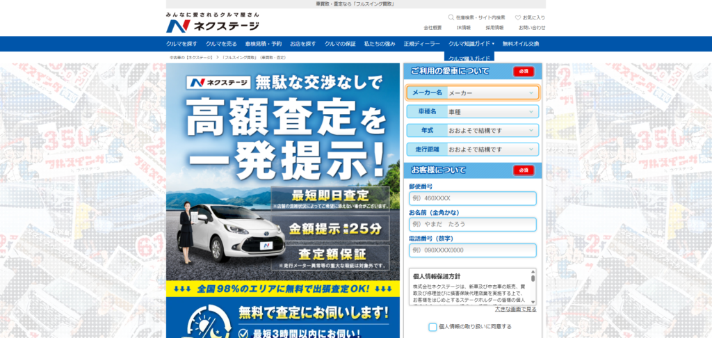 | ネクステージ | 買取業者 | 単独査定 | 無料 | あり | ・フルスイング買取で一発提示 ・全国300店舗超の大手 ・東証プライム上場で信頼性 |