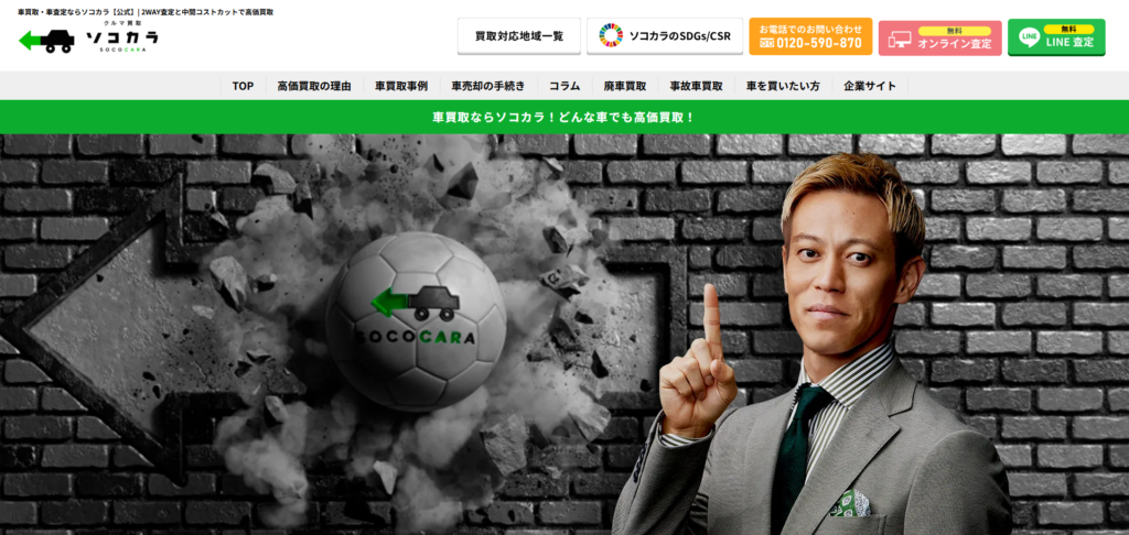 | ソコカラ | 買取業者 | 単独査定 | 無料 | あり | ・廃車/事故車/過走行に強い ・レッカー引取と手続きが無料 ・海外販路で値段が付きやすい |