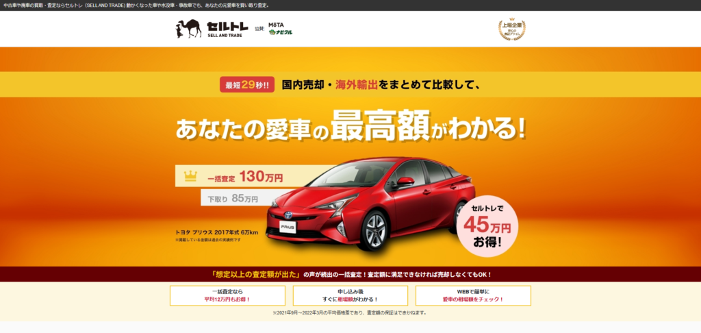 | セルトレ | 一括査定サービス | 記載なし | 無料 | あり | ・事故車/不動車/水没車も対応 ・中古車〜廃車まで幅広い ・上場企業運営で安心感 |