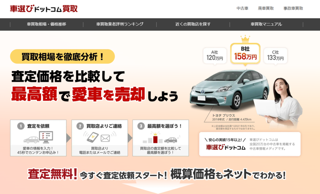 悪徳業者を避けつつ、できるだけ高く愛車を売りたい利用者のリアルなニーズにしっかりと応えてくれるサービスです。迷っている方は、ぜひ一度無料査定を試してみてください。