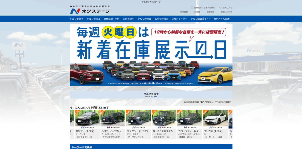 ネクステージ(NEXTAGE)は、全国に350店舗を展開する中古車販売・買取の大手企業です。1998年の創業以来、「お客様第一」の理念を掲げ、幅広い車種と価格帯を取り揃えた店舗づくりを進めてきました。